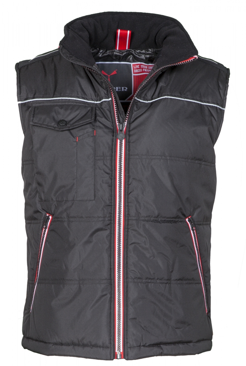 Unisex vest, contrasting 8 mm plastic zip with metal pull, contoured back, two roomy outer pockets with zip, roomy breast pocket for smartphone, badge holder ring, reflex piping on the chest and back. Padded, high-density lining, inner fleece ‘collar, one inner pocket.