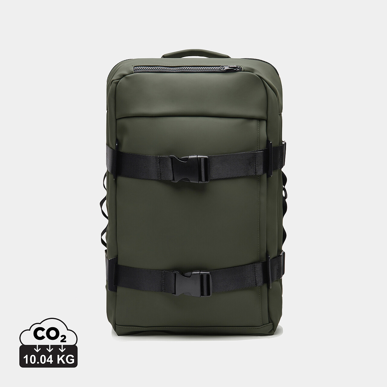 The ultimate companion for your adventures. Crafted with partly RCS certified recycled polyester. The exterior features a sleek PU finish, with mesh backing on the shoulder straps and back for maximum comfort. Designed for convenience, the bag can be fully opened for easy access. With multiple smart features, it offers a laptop compartment, two exterior pockets and a roomy mesh section inside to keep your gear organised. A sturdy top handle and a carabiner to secure smaller items. The clever strap at the back allows easy attachment to a trolley bag. A side zipper offers convenient access to the main mesh compartment. This is the ideal backpack for both daily commutes and weekend adventures. Certified by RCS (Recycled Claim Standard), RCS certification guarantees that the entire supply chain of recycled materials is certified. The total recycled content is based on the overall product weight. This product contains 16% RCS certified recycled polyester.