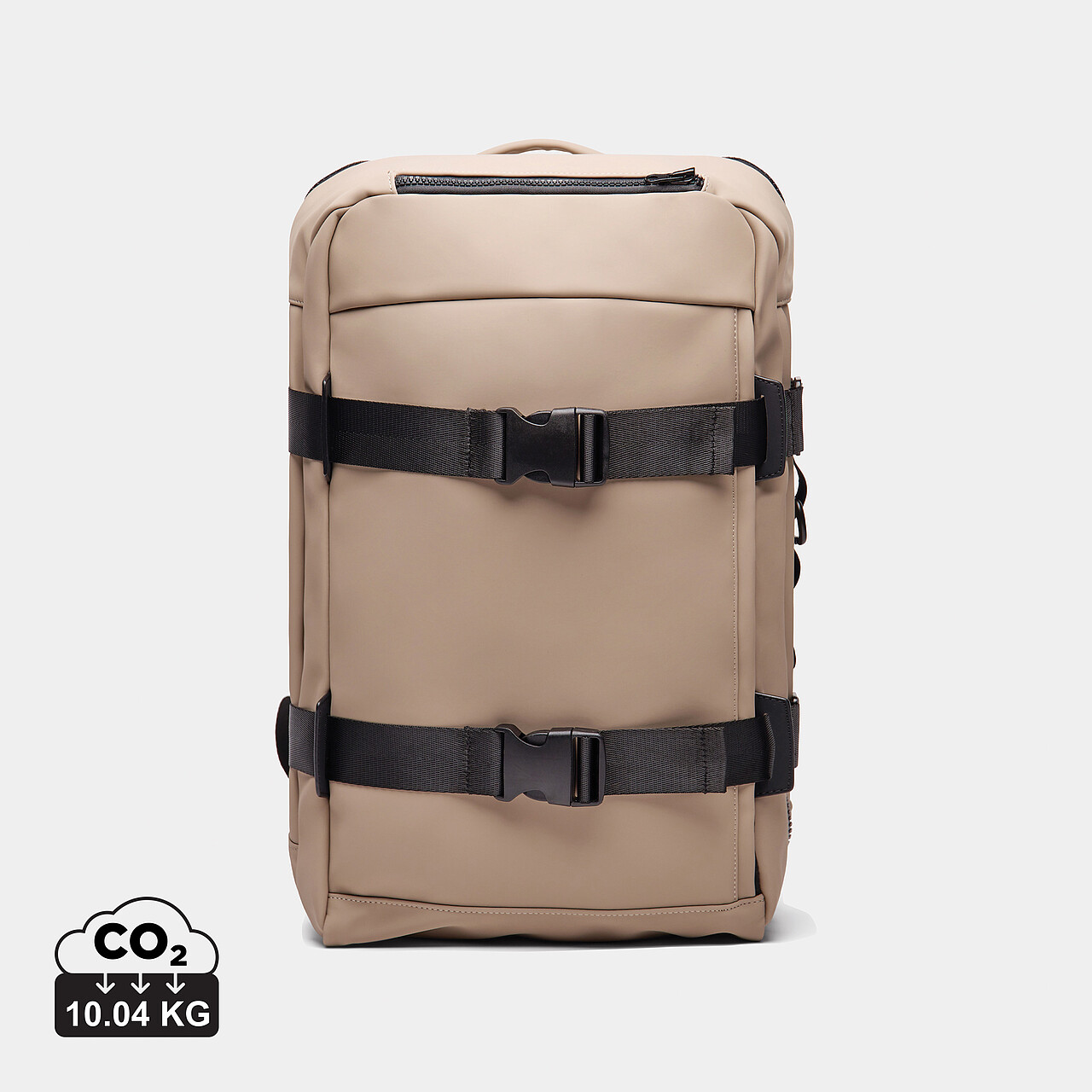The ultimate companion for your adventures. Crafted with partly RCS certified recycled polyester. The exterior features a sleek PU finish, with mesh backing on the shoulder straps and back for maximum comfort. Designed for convenience, the bag can be fully opened for easy access. With multiple smart features, it offers a laptop compartment, two exterior pockets and a roomy mesh section inside to keep your gear organised. A sturdy top handle and a carabiner to secure smaller items. The clever strap at the back allows easy attachment to a trolley bag. A side zipper offers convenient access to the main mesh compartment. This is the ideal backpack for both daily commutes and weekend adventures. Certified by RCS (Recycled Claim Standard), RCS certification guarantees that the entire supply chain of recycled materials is certified. The total recycled content is based on the overall product weight. This product contains 16% RCS certified recycled polyester.