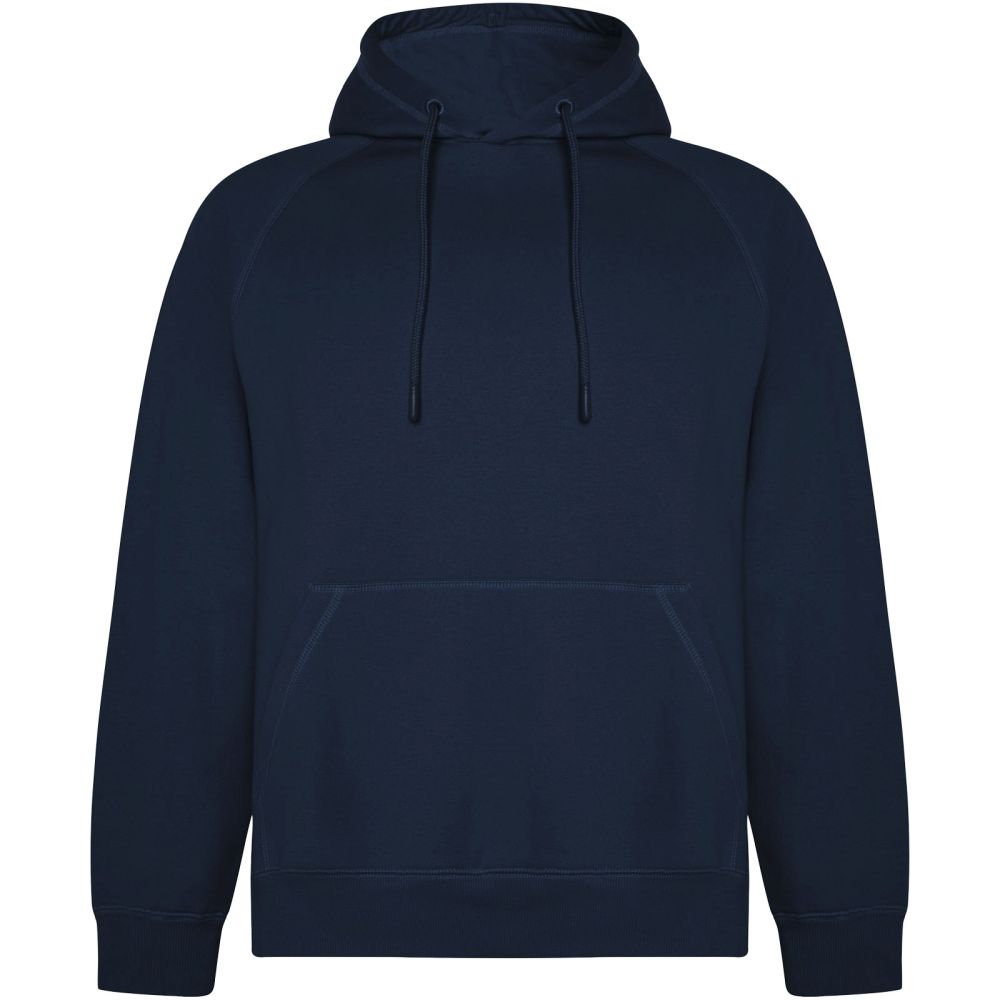 Unisex hoodie in organic cotton and recycled polyester. Kangaroo style pocket. Single jersey lining in hood. Round adjustable drawcord and embroidered eyelets. Cuffs and waistband in 2x1 ribbed fabric. Removable label. Individual recycled packing. The male model is 185 cm and is wearing size L, and the female model is 168 cm and is wearing size S.