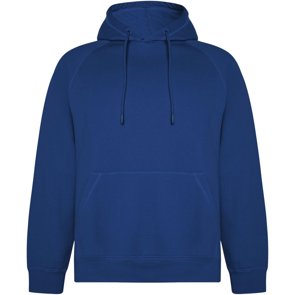 Unisex hoodie in organic cotton and recycled polyester. Kangaroo style pocket. Single jersey lining in hood. Round adjustable drawcord and embroidered eyelets. Cuffs and waistband in 2x1 ribbed fabric. Removable label. Individual recycled packing. The male model is 185 cm and is wearing size L, and the female model is 168 cm and is wearing size S.