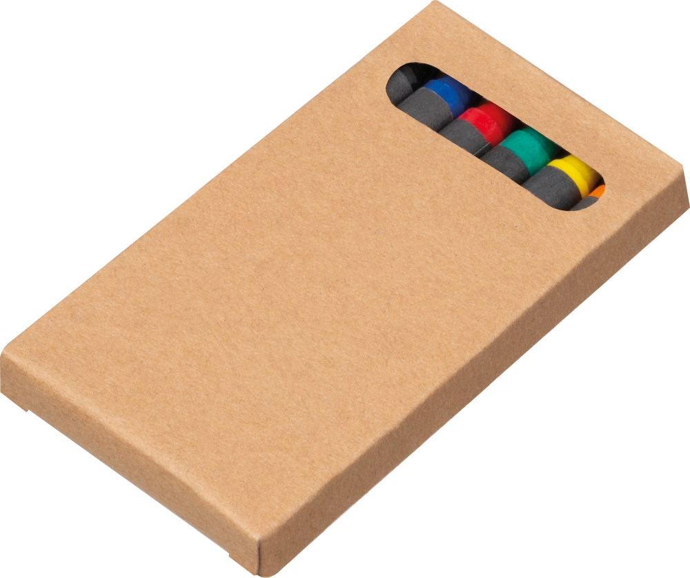 6-piece wax crayon set in paper packaging. We will print your logo on the packaging. Dimensions: 5,1 x 0,9 x 9,1 cm