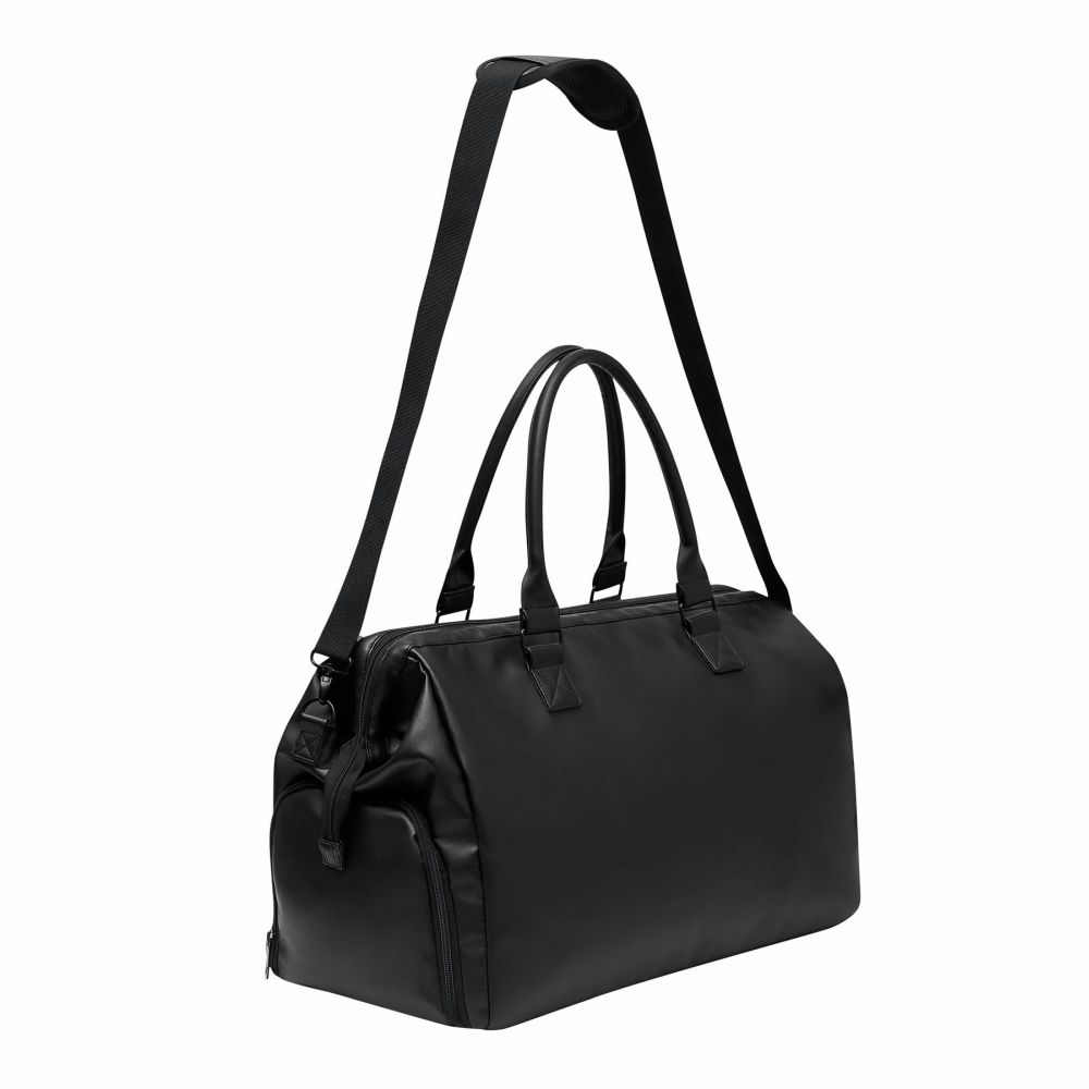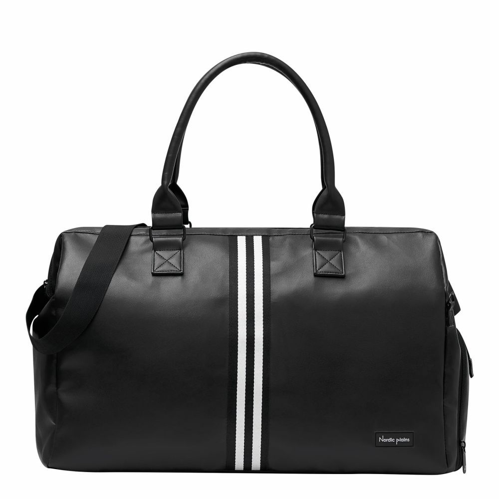 Weekender ROTTERDAM made of high-quality faux leather, with sportive-looking stripes on the front area, spacious main compartment with reinforced zippered opening that makes packing easy, reinforced bottom, 1 zippered shoe compartment on the side, 2 padded carrying handles, adjustable and removable padded shoulder strap, 1 zippered pocket and 2 slip-in pockets on the inside, a Nordic plains brand product