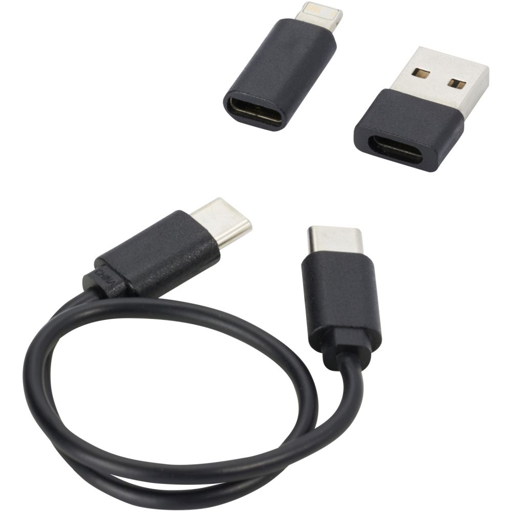 Modular data transfer and charging cable made from recycled plastic, delivered in an elegant storage box. The cable offers multiple charging solutions: Type-C and USB-A input, and Type-C/iOS/micro USB output. Thanks to all of these adapters and connectors, this cable allows you to charge most smartphones, cameras, power banks, earbuds etc. The cable has a maximum output power of 2A. Features an eject pin that comes in handy anytime you need to take out your phone’s SIM card. The storage box also has room to store a micro SD memory card as well as a nano SIM card, making this the perfect travel accessory. Cable length: 28 cm. Supplied in a 100% recycled kraft paper envelope.
