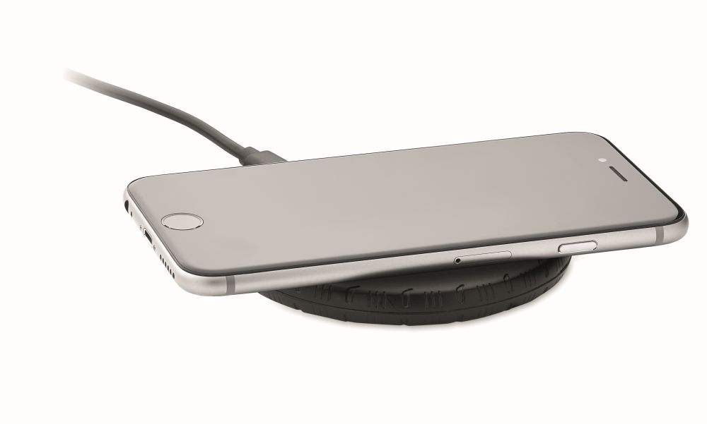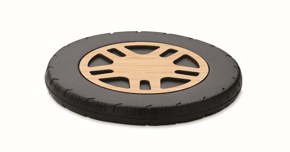 Wireless charger 15W in recycled ABS and bamboo top. Car tire design. Connect device to your computer, place smartphone on it and let it charge. Output: DC 9V/1.10A (15W) for quick charging. Compatible with all QI enabled devices such as latest Androids, iPhone® 8, X and newer.