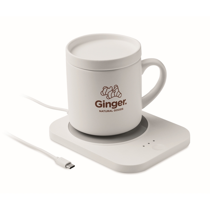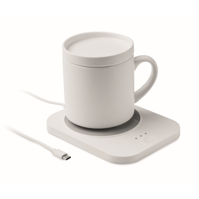 2 in 1 wireless charger 15W and mug warmer device in ABS. With ceramic mug with lid. Capacity: 250 ml. Keep drinks warm to a max of 50oC. 3 temperature settings with touch screen. USB connection cable. Output: DC 9V/1.67A (15W).Dimensions: 15 x 11,5 x 1cm