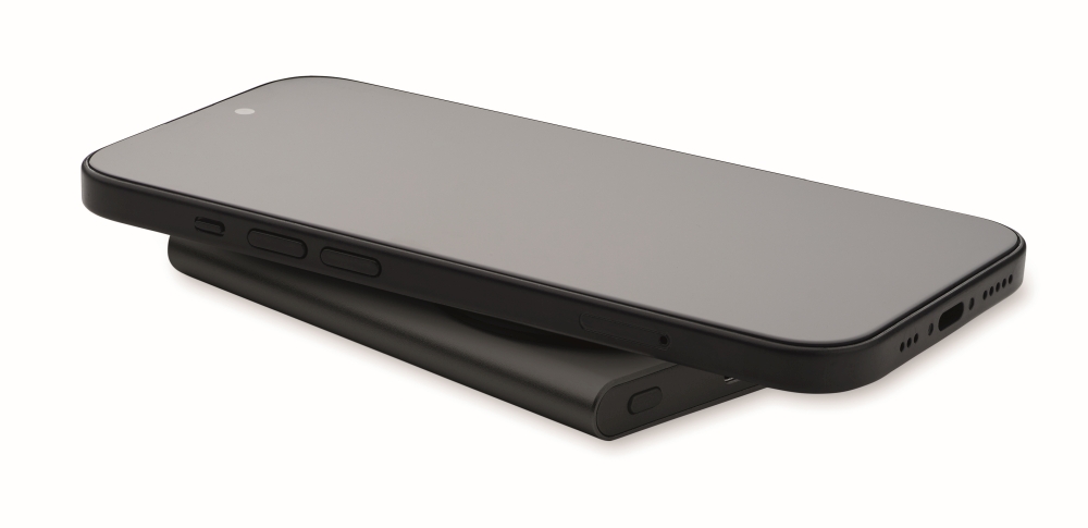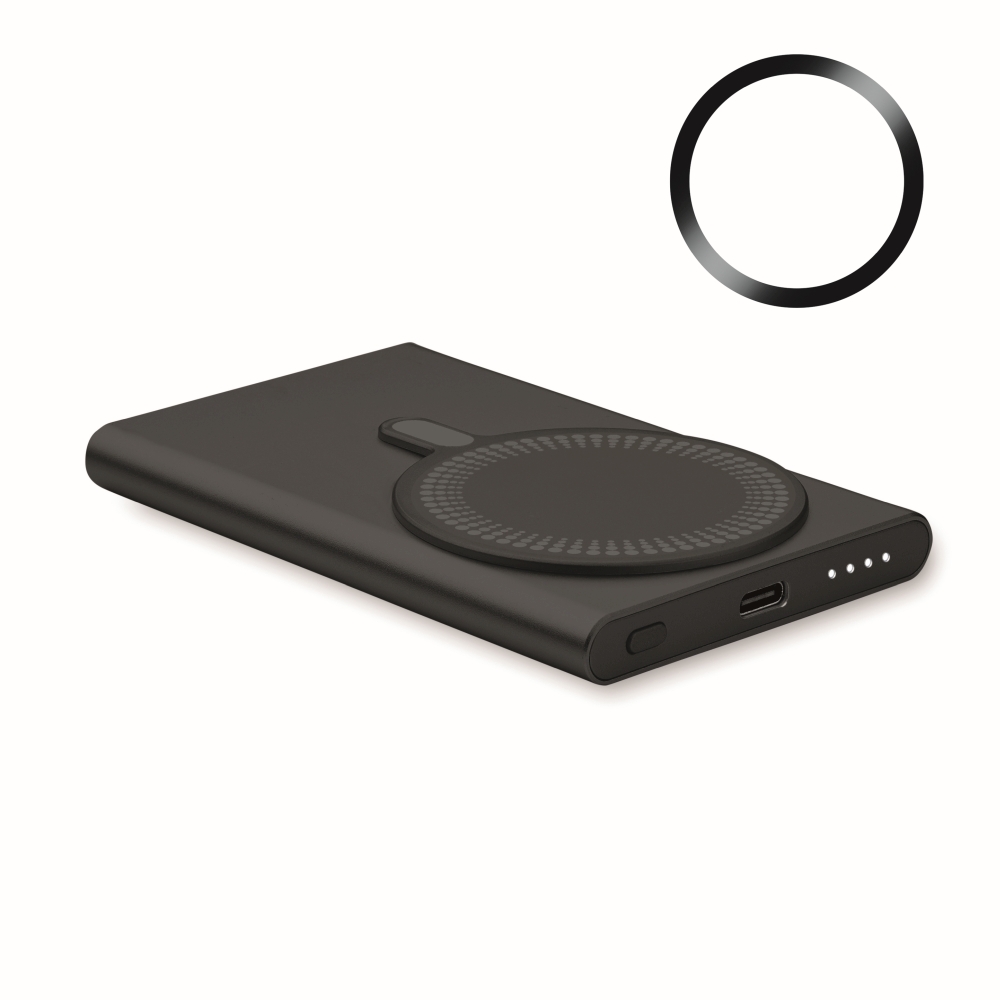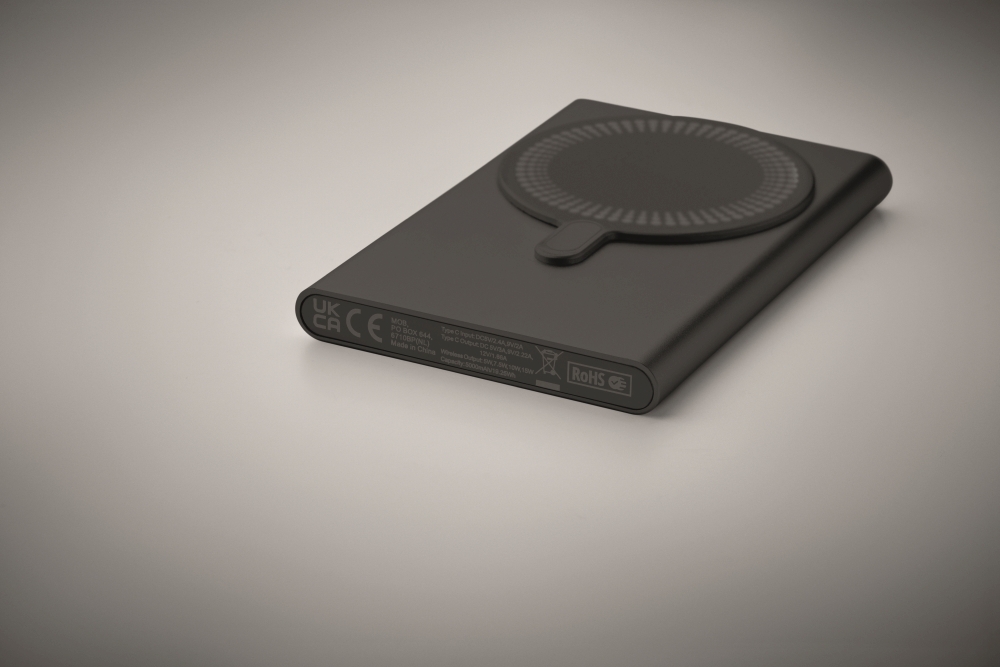 Magnetic wireless charger (15W) in recycled aluminium and power bank (5000 mAh). Output: DC 9V/1.66A. Supports quick charging technology (20W). In/Output: Type-C. Power delivery (PD) support to charge the newest laptop MacPro®. In/Output: Type-C. Dimensions: 6,7 x 10,2 x 0,95 cm