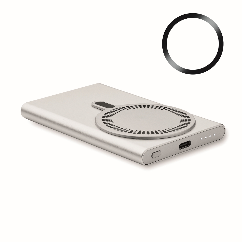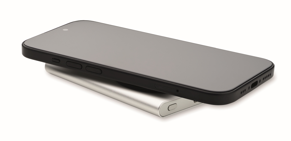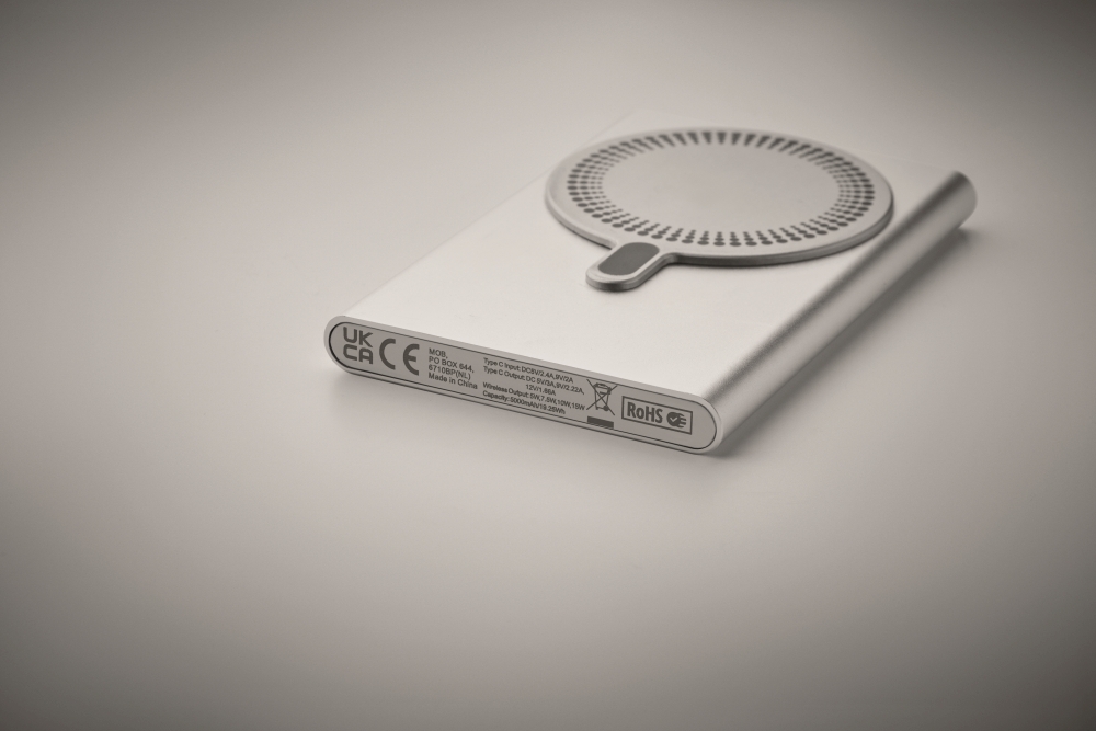 Magnetic wireless charger (15W) in recycled aluminium and power bank (5000 mAh). Output: DC 9V/1.66A. Supports quick charging technology (20W). In/Output: Type-C. Power delivery (PD) support to charge the newest laptop MacPro®. In/Output: Type-C. Dimensions: 6,7 x 10,2 x 0,95 cm