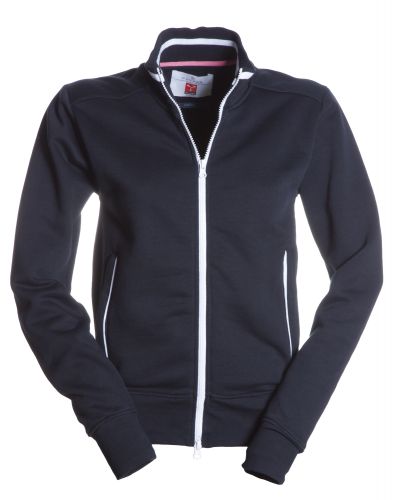 Women’s fitted sweatshirt with full, contrasting coloured plastic SBS zip with double metal pull. Rib collar with contrasting trim, side pockets with contrasting trim, fitted sleeves, two outer pockets with contrasting zip, stretch rib cuffs and hem, reinforced seams.